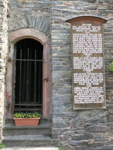 A unique feature in Enkirch is the ominous “Drilles and Spilles”, an unusual rotating cage which was constructed in the Middle ages to humiliate and punish wrong doers (in the same spirit as the stocks or the Scottish “jougs”) . Those sentenced to spend time there were apparently subject to the ridicule of towns-folk who would rotate the cage at regular intervals much to the aggravation of the interne. Later the cage was used during colourful local festivals for the “auction of maidens” (though apparently this was conducted in “good humour” by all those involved). Looking at the oppressive cage today though, its easy to speculate that it could have been the scene of some of the darker episodes of Enkirch’s long history.