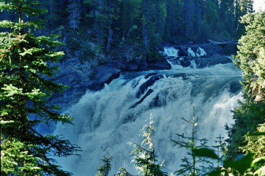 We took the pedestrian option and paddled across the still waters of the lake to the start of the Caribou Falls Trail, one of the few walking routes in the Park. We strolled peacefully through the dappled, shady old growth forest, feeling less concerned now about the bears and their unwelcome attentions. Soon the distant sound of the Falls grew in resonance to become an omnipotent boom, reverberating through our heads and the surrounding back country. Over the brow of the hill we found ourselves staring down at the foaming torrents, churning water cascading into the abyss, 150ft below. The river continues from here into the distance down a steep canyon, through a series of further falls. Feeling more fortunate now with our lot, we turned and headed back to camp and the prospect of more “fresh” food.