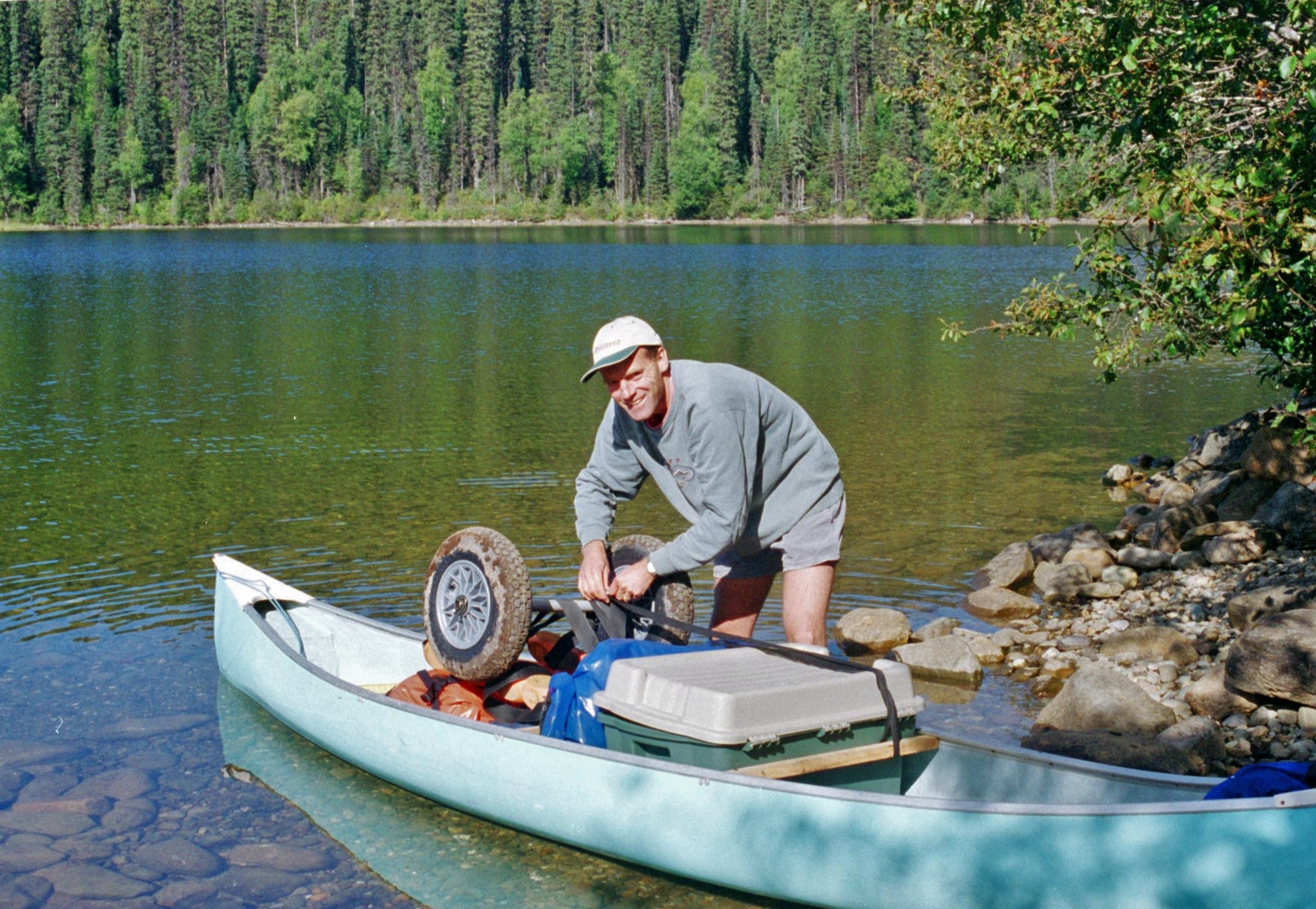 We headed off, a dishevelled pair, pushing our canoe upslope on the first portage, away from the crowds and their latest designer outfitted gear. We flattered ourselves thinking that we looked like the real mountain men. The route commences with 5km of unrelenting uphill toil until Kibbee Lake, the first one, is reached. Our hired portage trolley (our one other concession to modernity) proved to be a blessing and our canoe bumped along the forest trail quite happily. Soon we were waterborne and paddling off into the start of the first lake, the start of the real adventure.