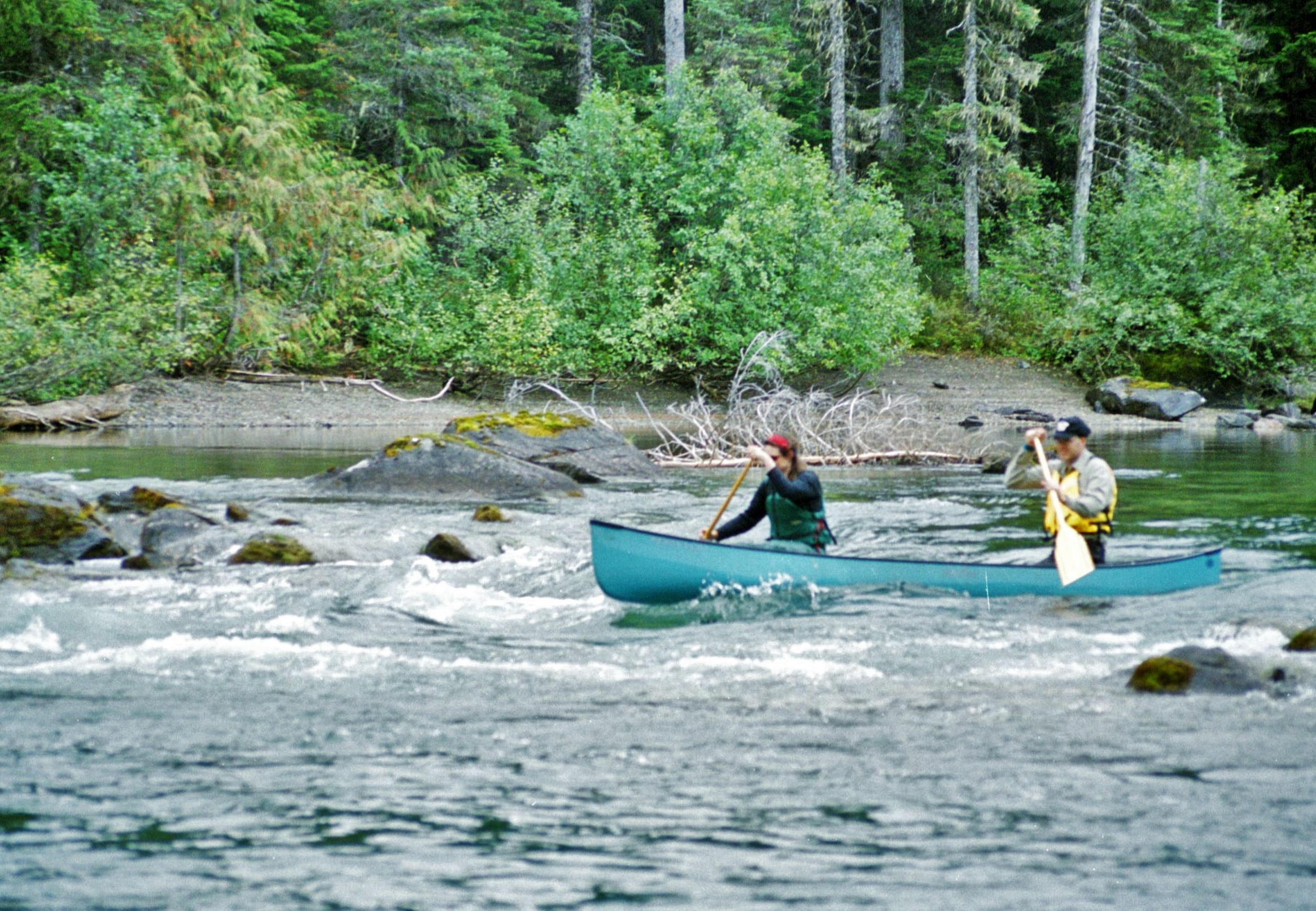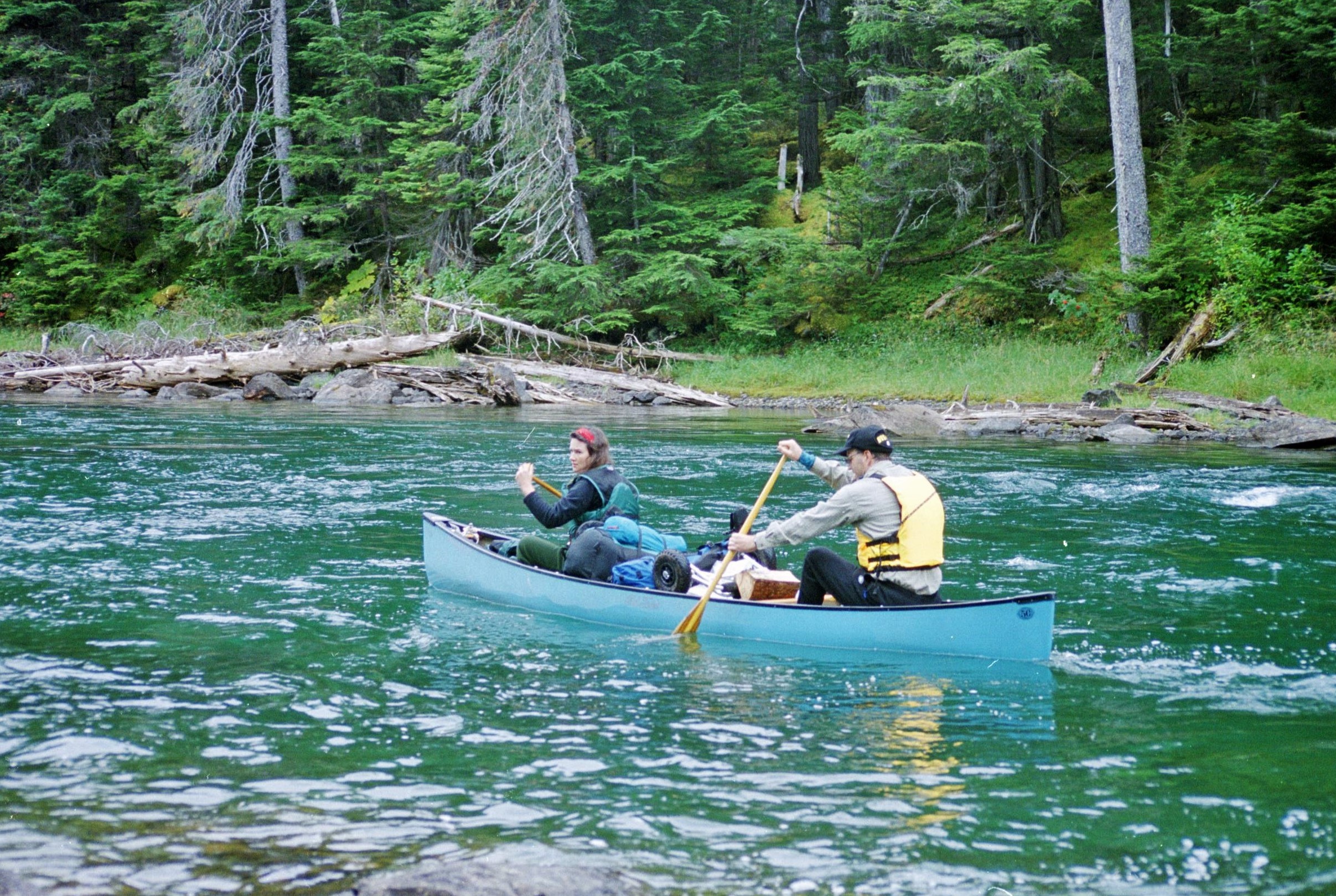 Soon we began to notice the canoe being pulled along in the flow as McLeary began to empty into the silt laden waters of the Caribou River. By now we were feeling more cocky and self-confident about our ability to control the canoe in a current. Ken navigated down the river, carefully avoiding deadheads (upright tree trunks hidden in the silty waters) and sweepers (trees overhanging the current from the riverbank).