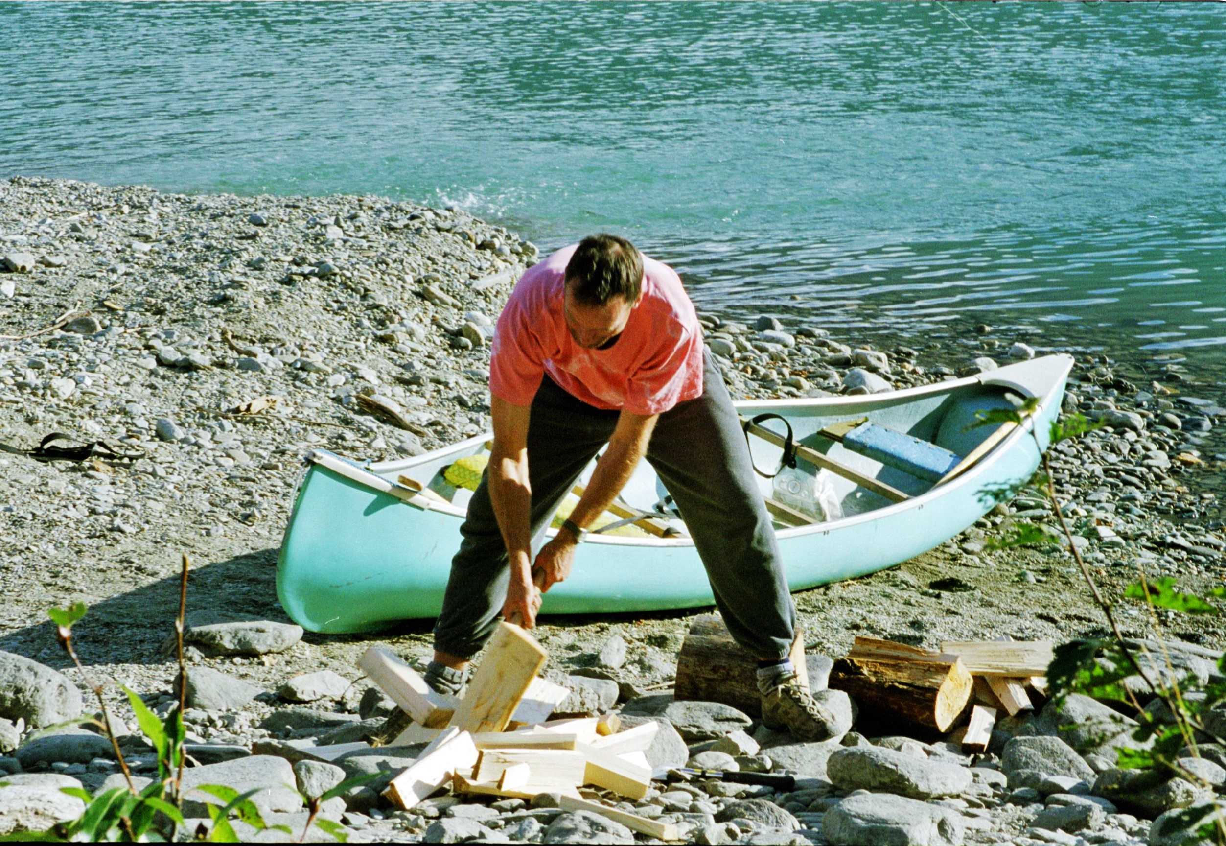 Daylight revealed that our location was not so remote and that in fact, our camping place was surrounded by other campers and trailers. Ken had made all the arrangements. He was on some special dietary fad at the time which, he explained, involved eating lots of “fresh food”. This consisted of an enormous array of vacuum packed steaks, chicken, salmon and pulses, all of which filled a couple of large cooler boxes. Other canoeists eyed us with envy and suspicion from behind their meagre stashes of freeze-dried gunk. I imagined too that the bears might be getting quite excited about our steaks, especially after they’d had to chance of getting “high” in an open canoe for a couple of days.