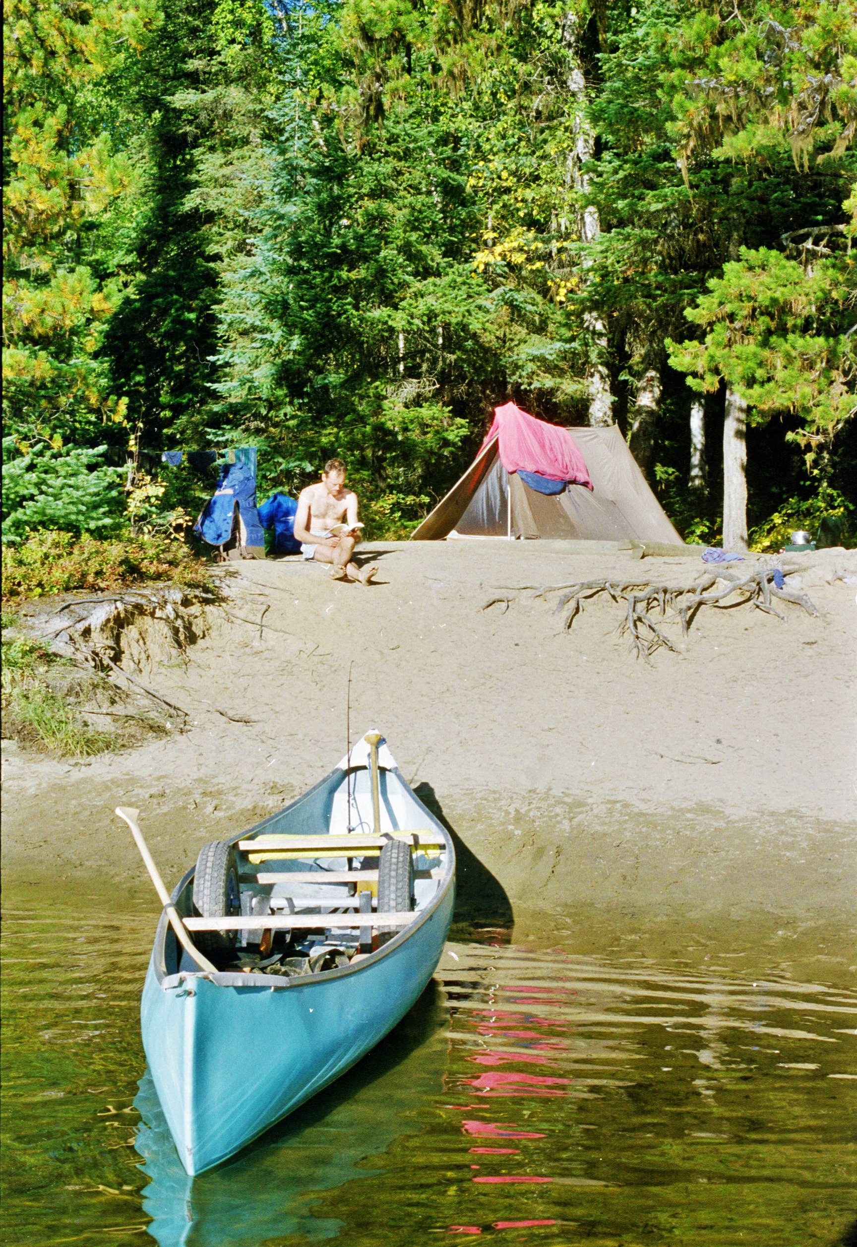 Another portage took us to Issac Lake, which at 42km, is the longest lake in the chain. Turning the first corner of the lake, we took a short cut and soon found ourselves hitting heavy swell. Suddenly we realised just how far offshore we had gone. “Don’t worry”, said Ken, “This canoe can float, even if it does capsize!” Greatly reassured by this and forgetting everything I’d ever read about hypothermia and the unlikely prospect of rescue, we paddled boldly onwards for the second night’s camping on the beach at Moxley Creek.
