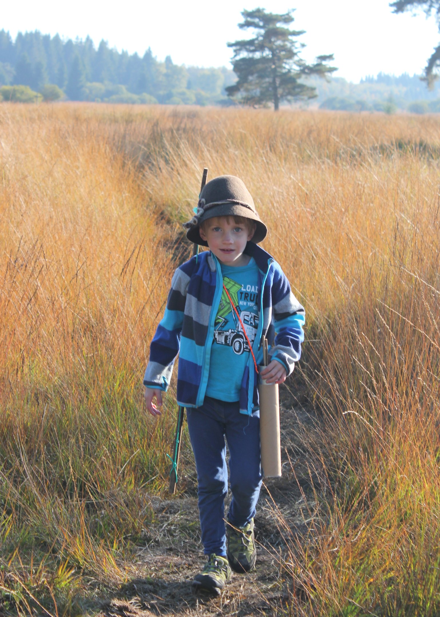 The Hohes Venn landscape found in the nearby Eifel region is an area of moorland and raised bog which was, at one time, extensively planted up with exotic confers during the time of the Prussians. These areas are now opened out again, drains are being blocked up and open moorland habitats are once again being restored. At this time of year, the Hohes Venn has a wonderful “savannah” type character with moorland grasses interspersed with birches, rowans and scots pines. My son got into the part of being a bushman and brought along his home-made bow and arrow (though I think his plan had been to be Robin Hood rather than the Masai Mara).