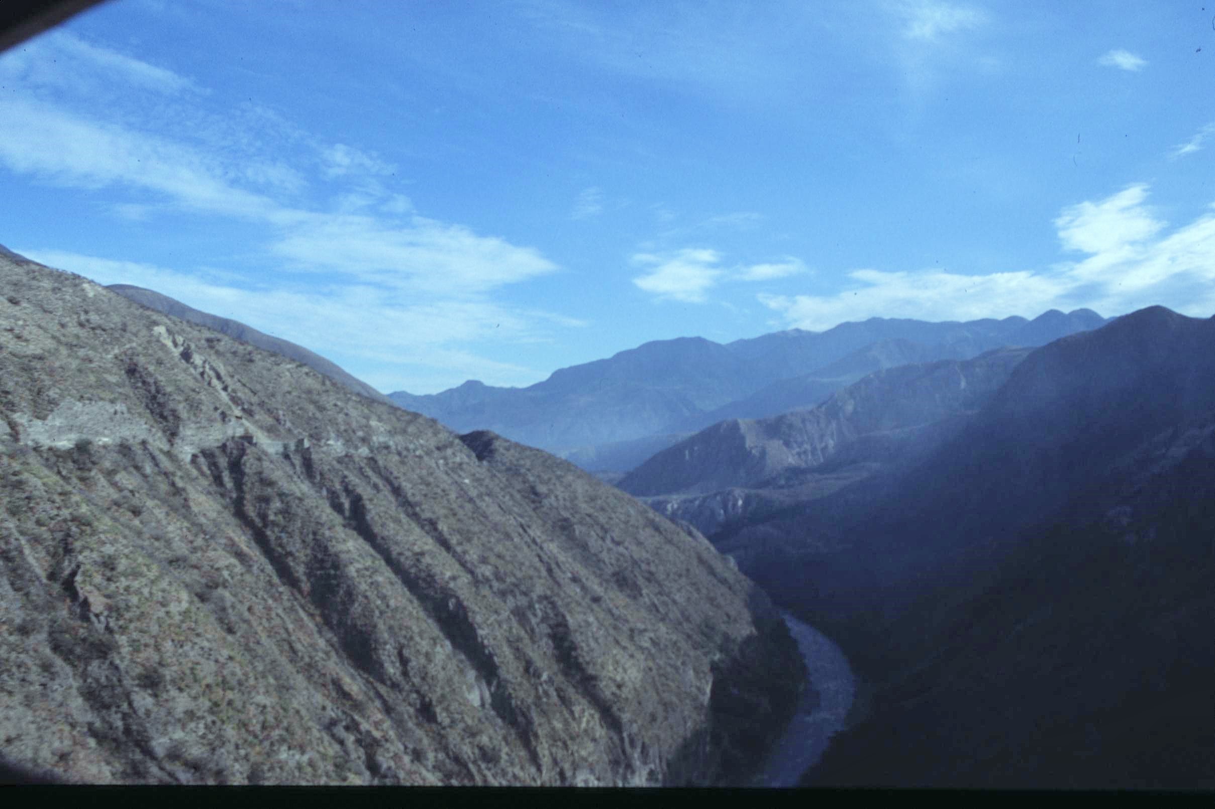 The descent from the high valleys of the Andes to the tropical lowlands was spectacular and exciting to say the least. However, sitting up on top there you certainly had to remember to duck everytime you came to one of the frequent tunnels, there being just about enough head room to pass under safely, as long as you kept your wits about you. The drops to the side were also impressive and certainly tended to focus one’s mind about the need to keep clinging on tightly to avoid sliding off into oblivion. This was rail travel Indiana Jones style without a doubt – I decided, after that, I would never complain about conditions on British or Continental rail journeys again.